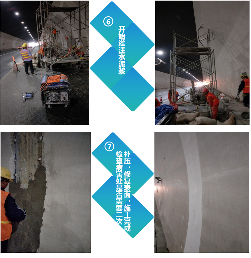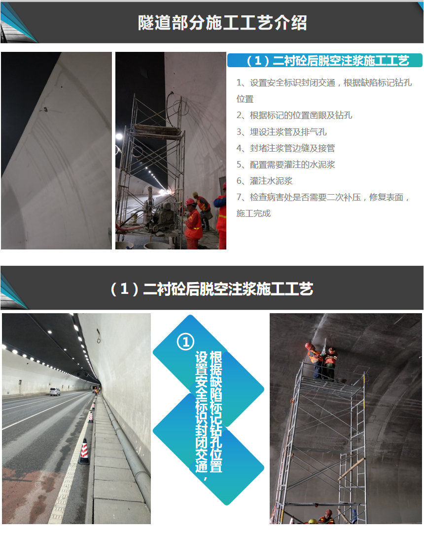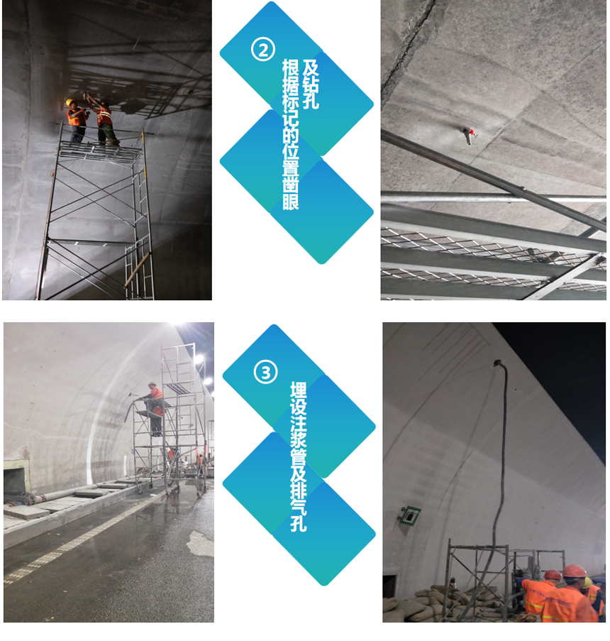 【概要描述】1、設(shè)置安全標(biāo)識(shí)封閉交通,根據(jù)缺陷標(biāo)記鉆孔位置 2、根據(jù)標(biāo)記的位置鑿眼及鉆孔 3、埋設(shè)注漿管及排氣孔 4、封堵注漿管邊縫及接管 5、配置需要灌注的水泥漿